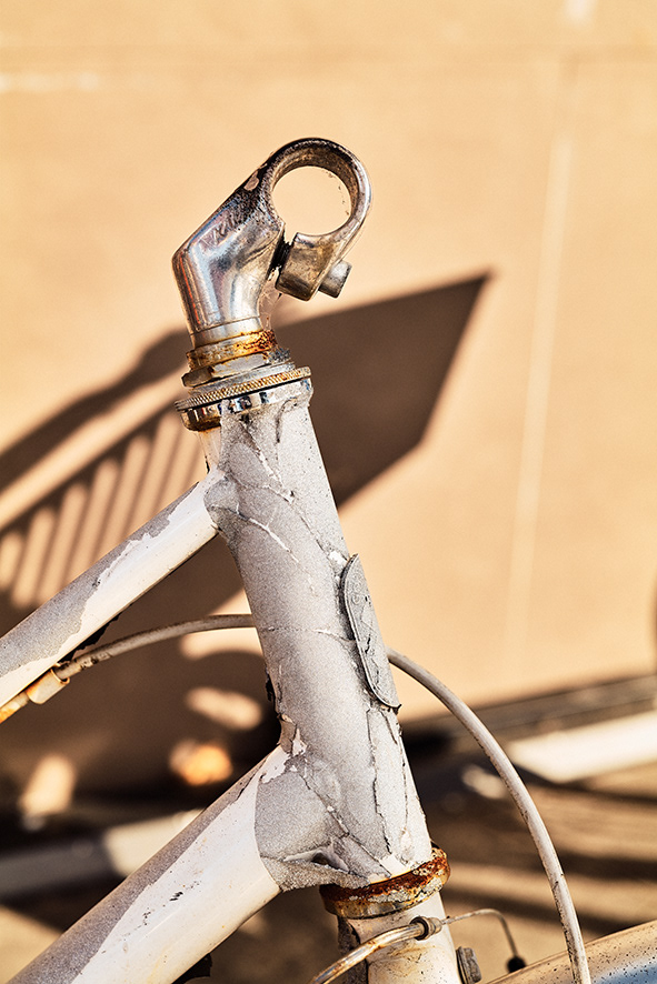 Each photograph is an intimate study of texture and resilience, a meditation on how oxidation becomes ornament, how wear becomes distinction, how neglect can, paradoxically, reveal character. These aren’t pristine showroom machines but street-side companions, locked to poles and leaned against walls, still doing their job despite — or perhaps because of — their imperfections.
