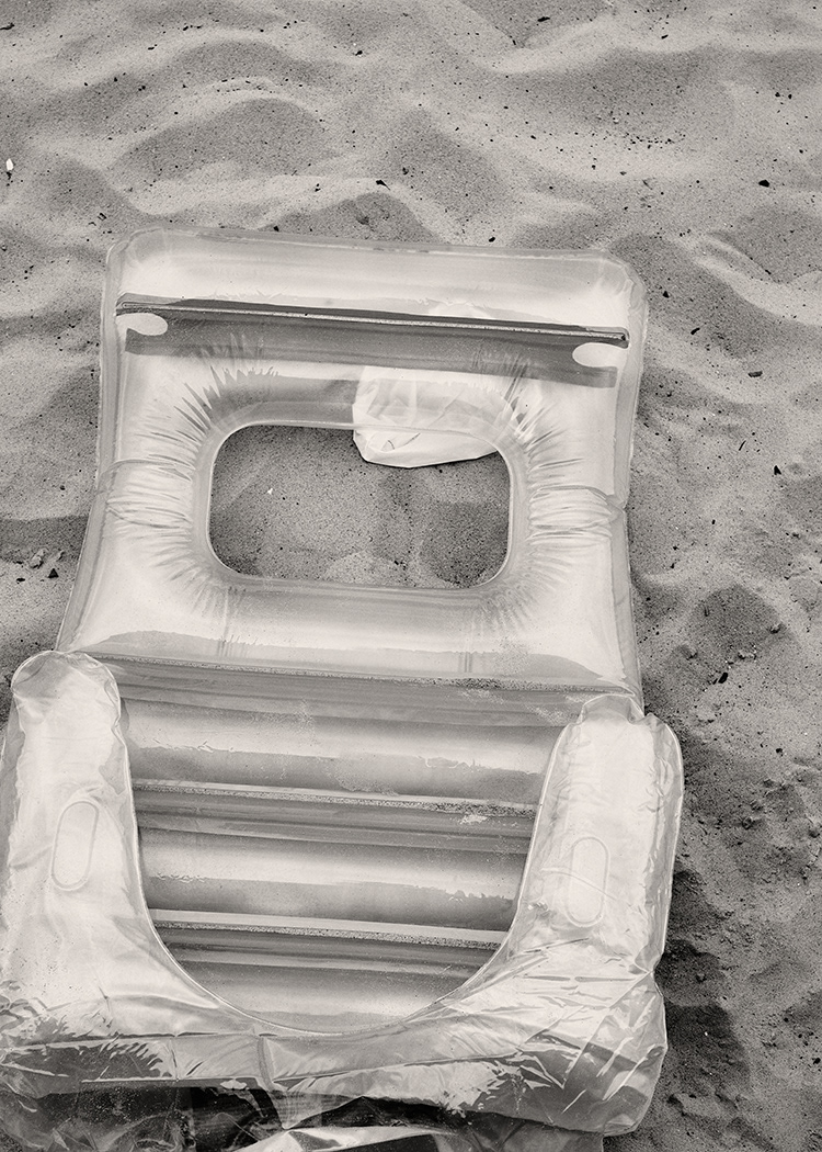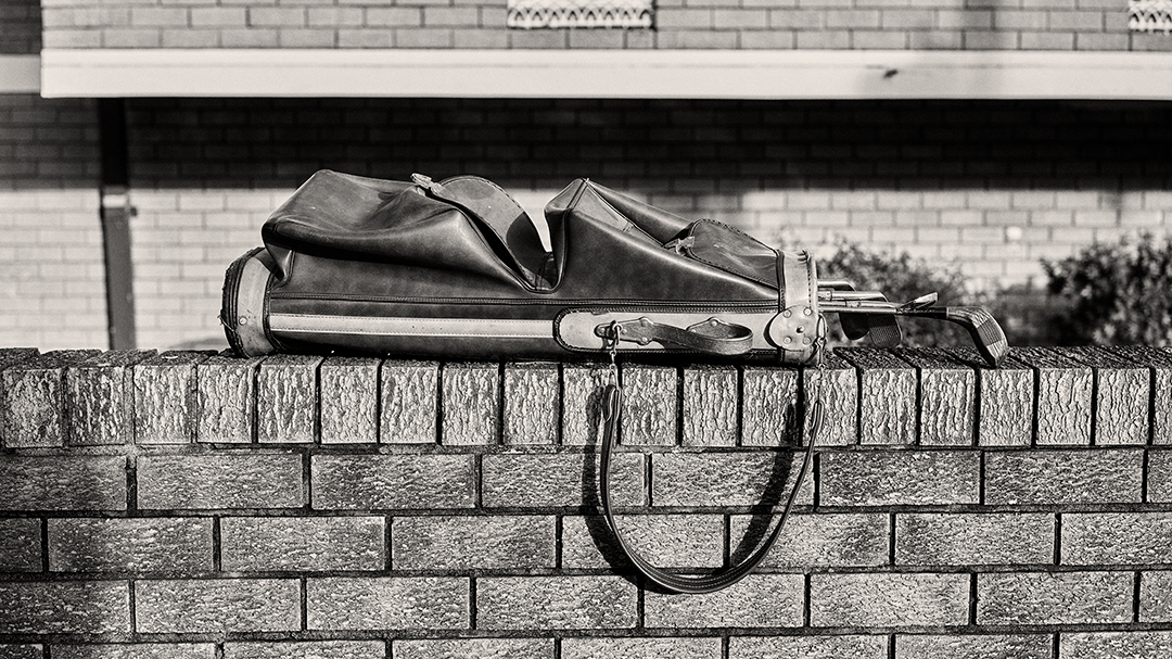 The series returns to beach leisure with an inflatable pool chair abandoned on sand, its deflated form capturing the melancholy end of a summer day or season. The collection concludes with a random set of abandoned golf clubs resting on a brick wall that speaks to forgotten recreational moments and creates a reflective ending to this observed journey.