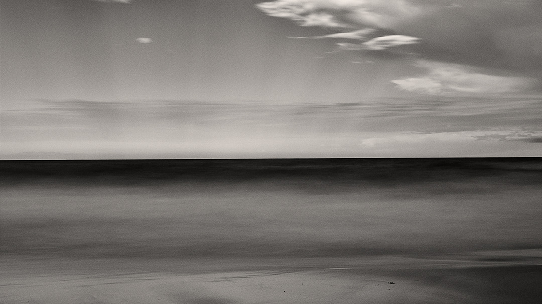 The collection opens with weathered timber planks arranged in varying heights, their rough-hewn textures and natural grain creating a study in organic geometry that sets both the monochromatic tone and focus on found details. The series then establishes its coastal setting with a view of the ocean's edge, where the water naturally blurs as it meets the sand, creating an ethereal boundary between elements.